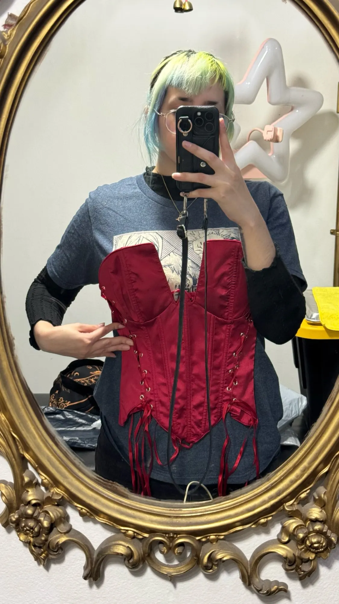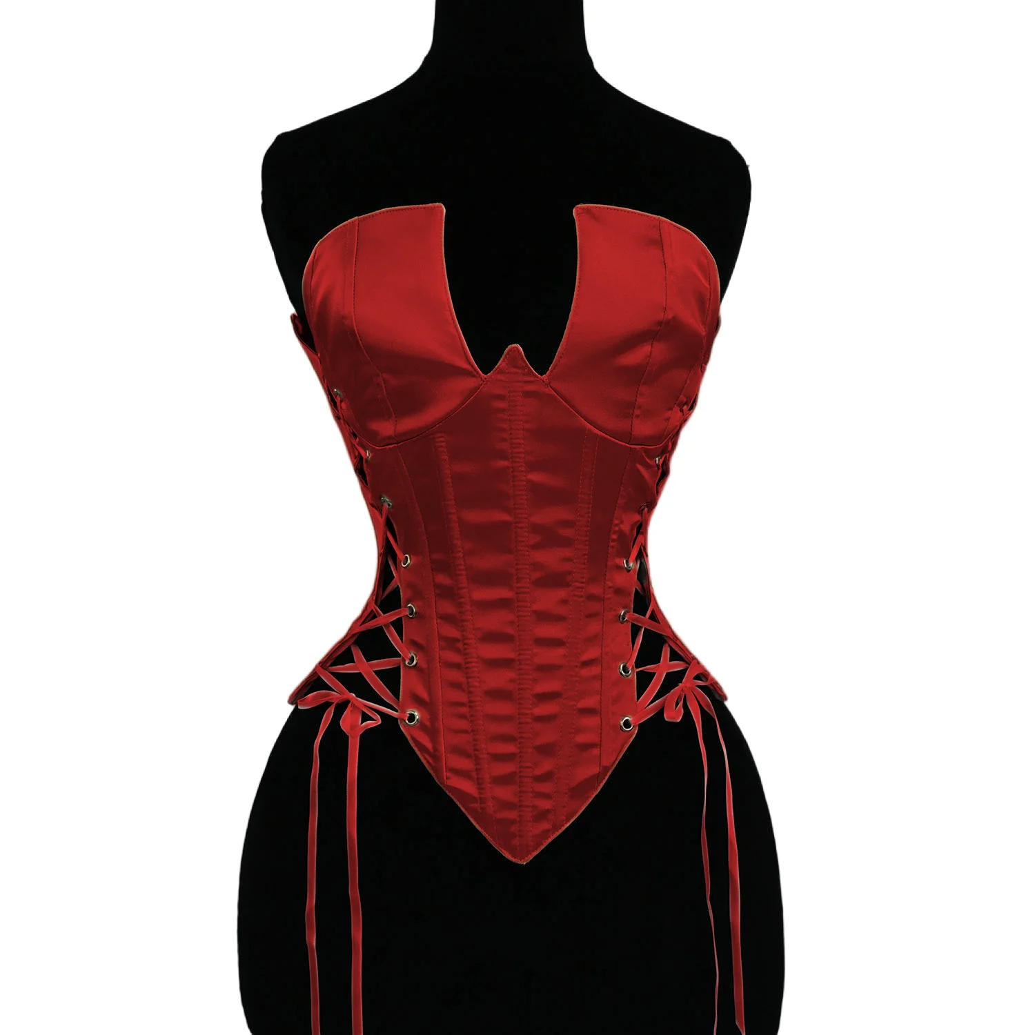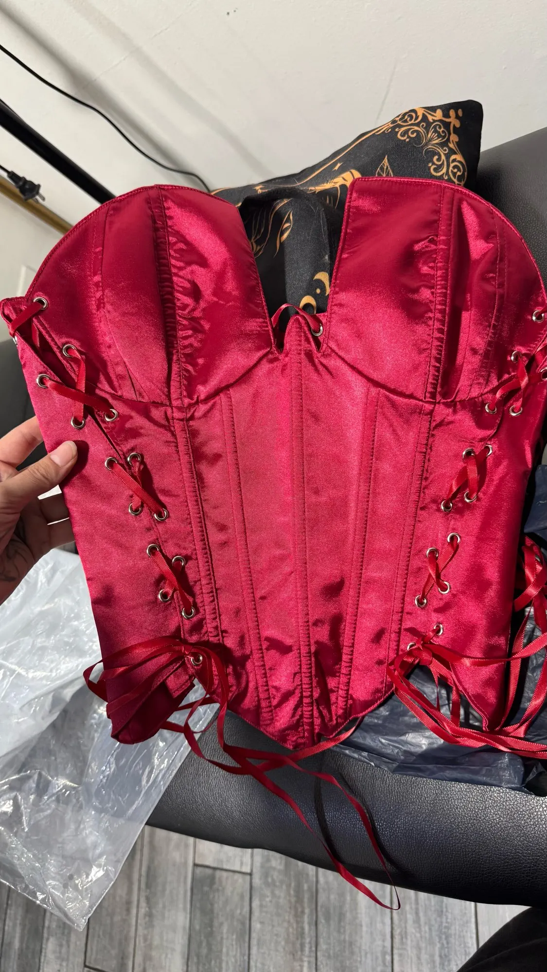 Turn heads and cinch hearts in the Crimson Hourglass Satin Corset — a sultry statement piece designed to sculpt, seduce, and shine. Crafted in rich wine-red satin, this corset features a dramatic sweetheart neckline with a central notch, structured boning for a flawless hourglass silhouette, and side lace-up detailing that adds a touch of vintage romance. The back boasts a full lace-up closure with flowing ribbons for customizable fit and undeniable drama. Whether styled solo or layered over sheer blouses and dresses, this piece is pure power meets elegance.