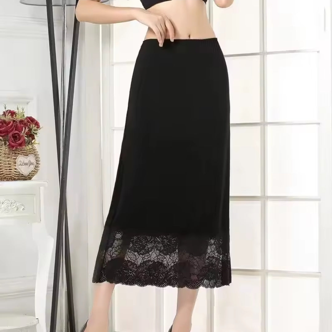 A straight‑cut midi skirt that falls cleanly to a sheer lace finish, adding lightness and detail at the edge. The silhouette stays sleek through the hips and drops to a refined, mid‑calf length, with the lace providing a soft contrast to the simple line. Versatile by design, it pairs easily with fitted tops or structured layers for day‑to‑night dressing.