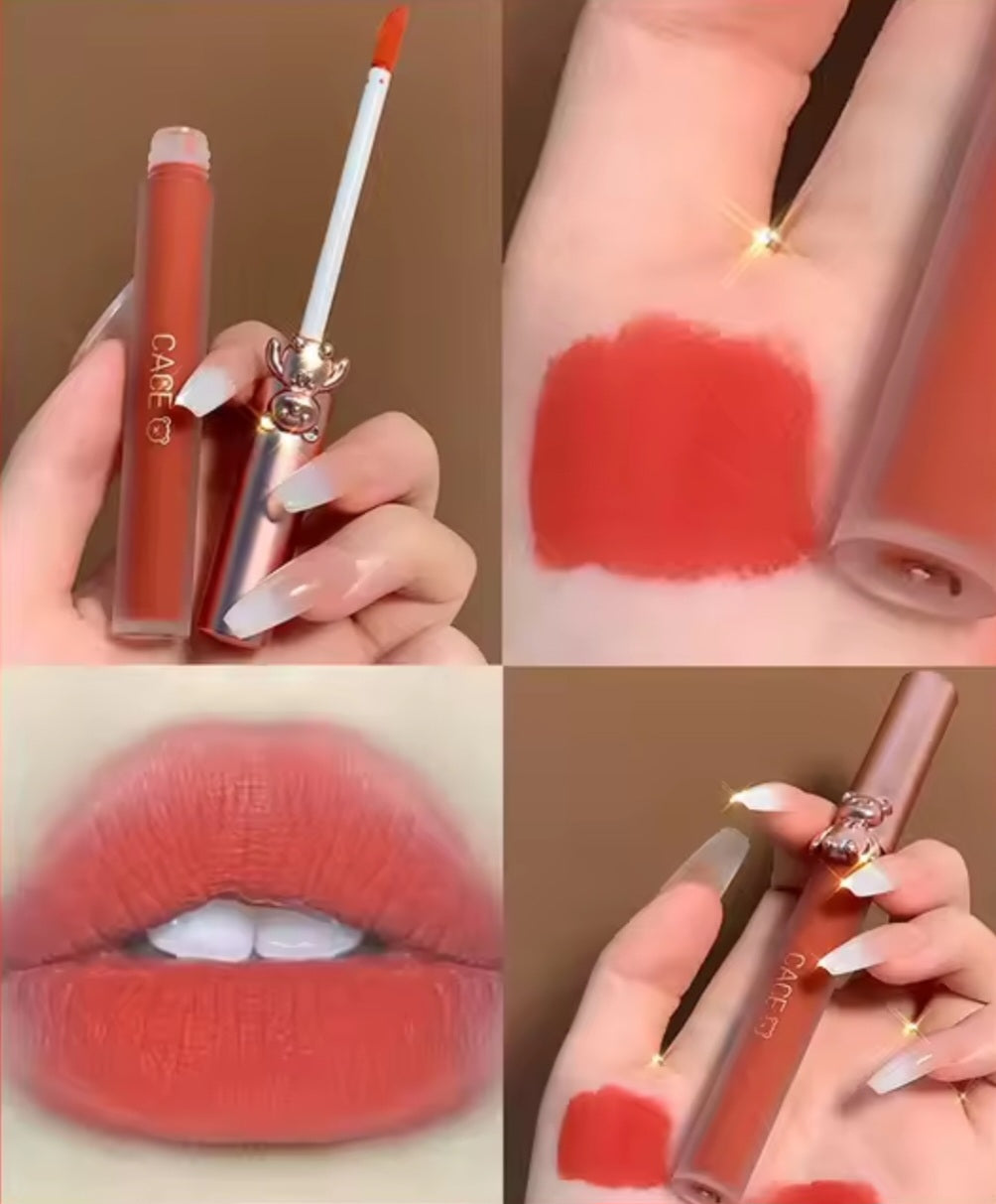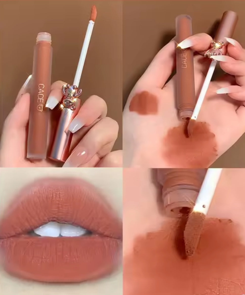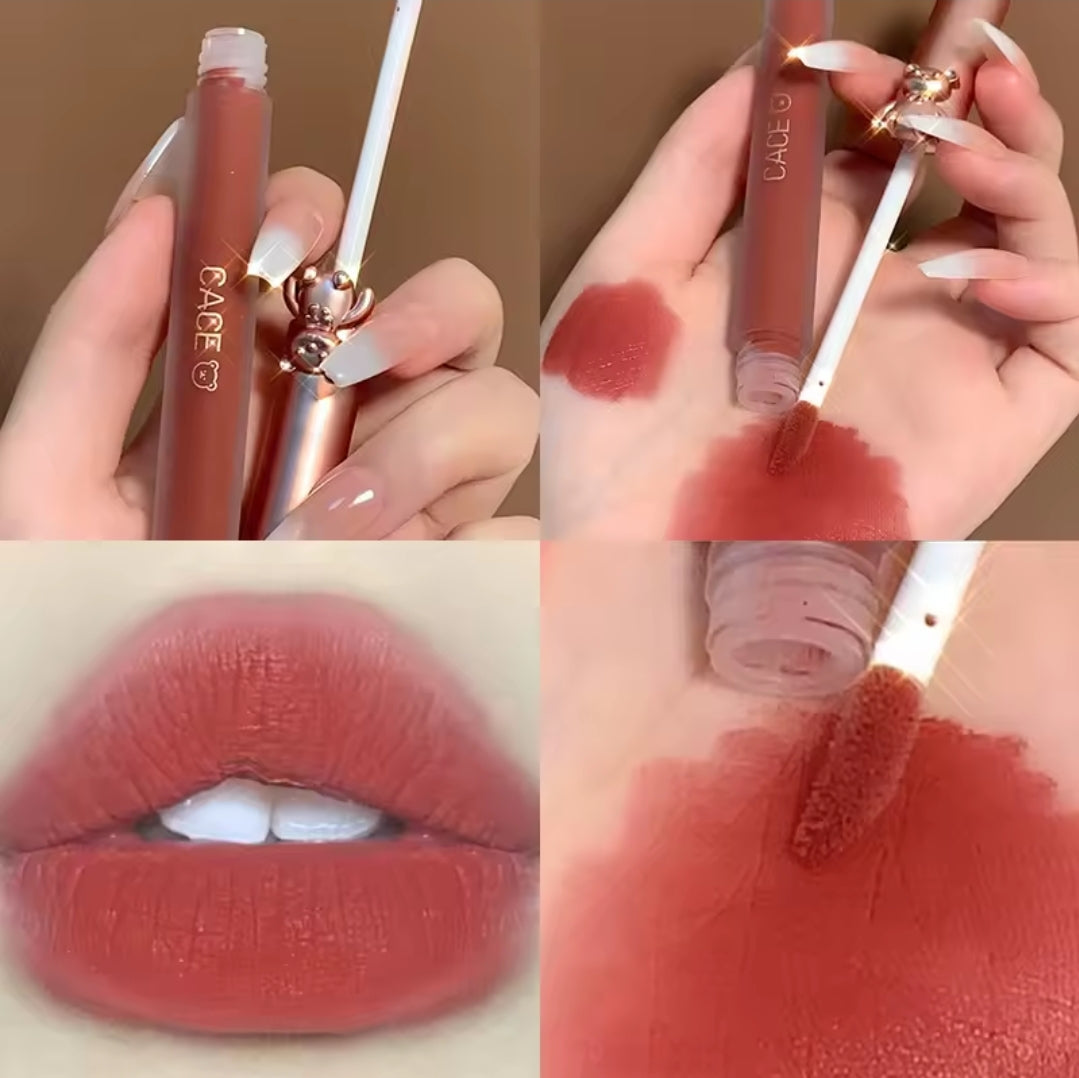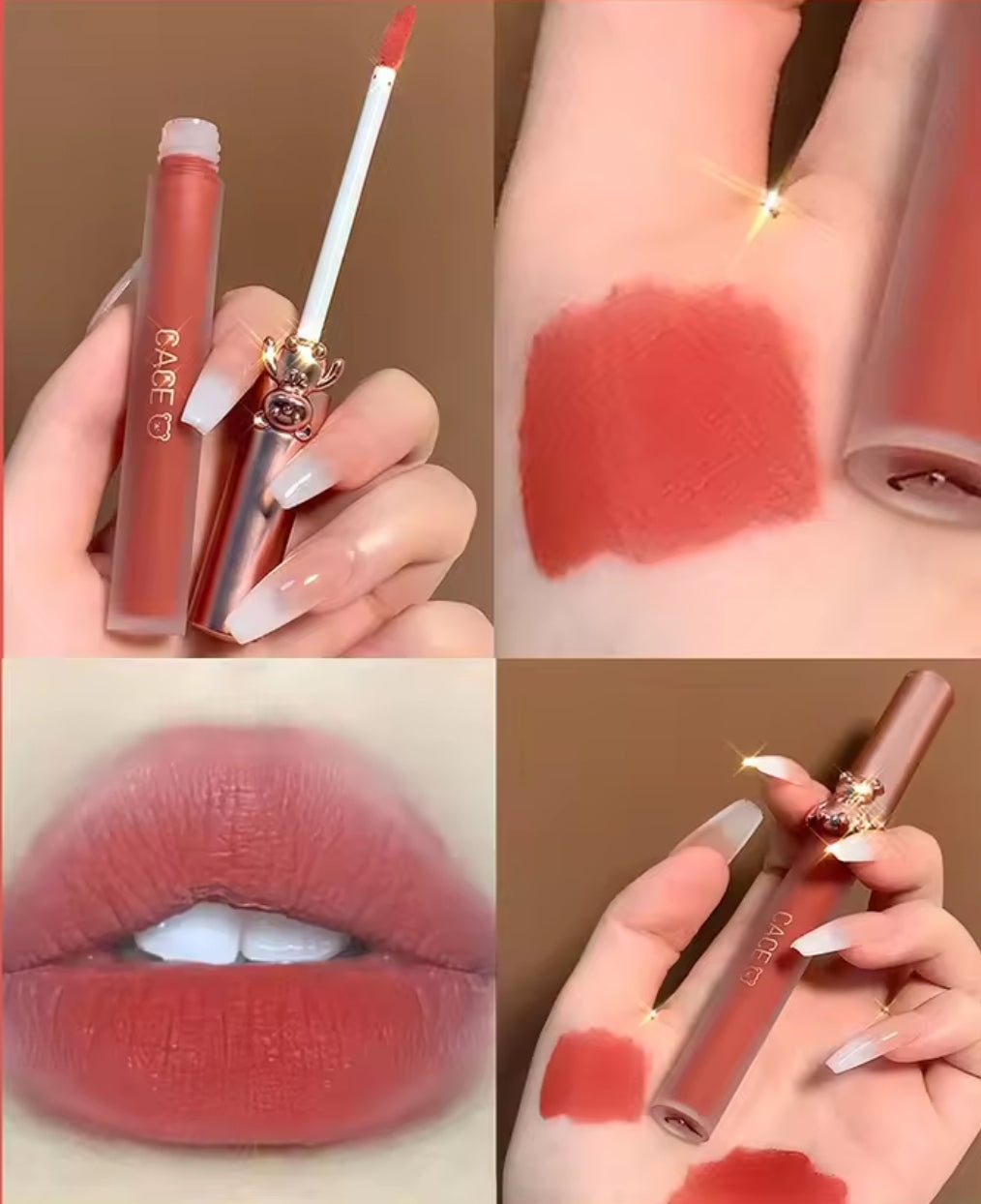 A playful, collectible lip gloss presented in squat, matte tubes topped with a metallic bear‑shaped cap and a small heart logo. The frosted bodies reveal warm, reddish‑brown tones while the decorative caps add a whimsical, shelf‑worthy touch that reads both fun and refined.