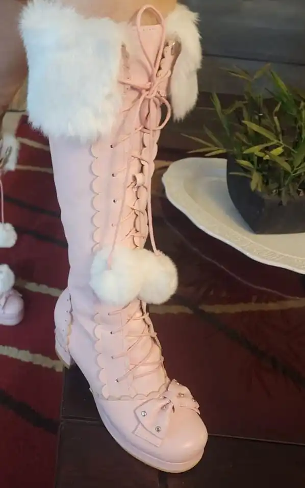 Step into a fairytale with our Lolita Winter Lace-Up Heeled Boots — where cozy meets coquette. These knee-high stunners feature plush faux fur trim, delicate pom-pom accents, and a chunky heel with platform sole for elevated comfort and style. Designed for the dreamer with a bold edge, they’re perfect for winter strolls, cosplay parties, or adding a whimsical twist to your everyday look.