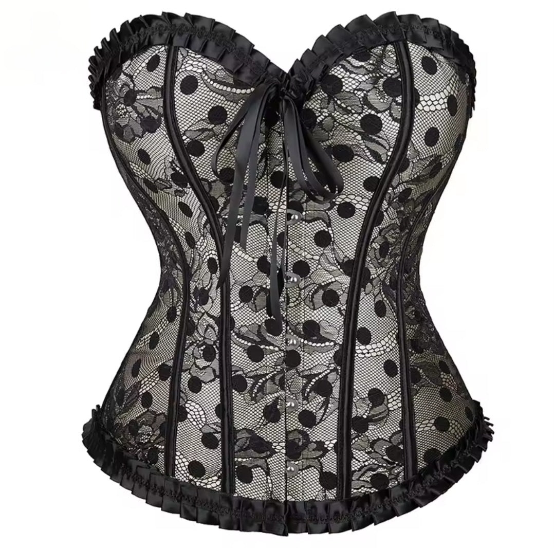A fitted corset with a patterned bust panel, embroidered midsection, and layered ruffle trim; vertical boning and shaped panels provide firm waist shaping while reinforced seams ensure durability. Back lacing allows a customized fit, and small bows at the hem add vintage ornamentation—suitable for intimate wear or theatrical styling when you want ornate detail with structured support.