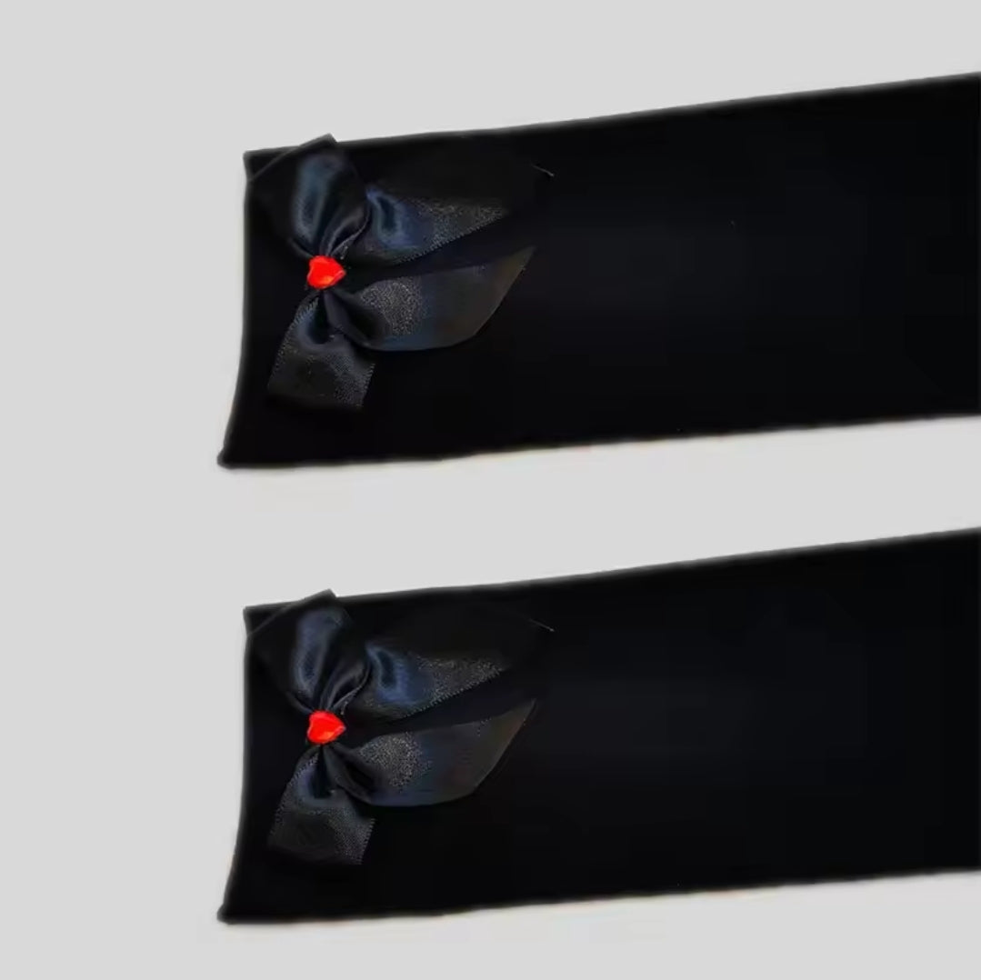 Fresh, bright, and unapologetically girly. These thigh-high stockings bring instant charm and create a polished silhouette with their crisp white finish. at the top, oversized satin bows add playful drama, while glossy red hearts deliver a sweet pop of color that makes them impossible to ignore.