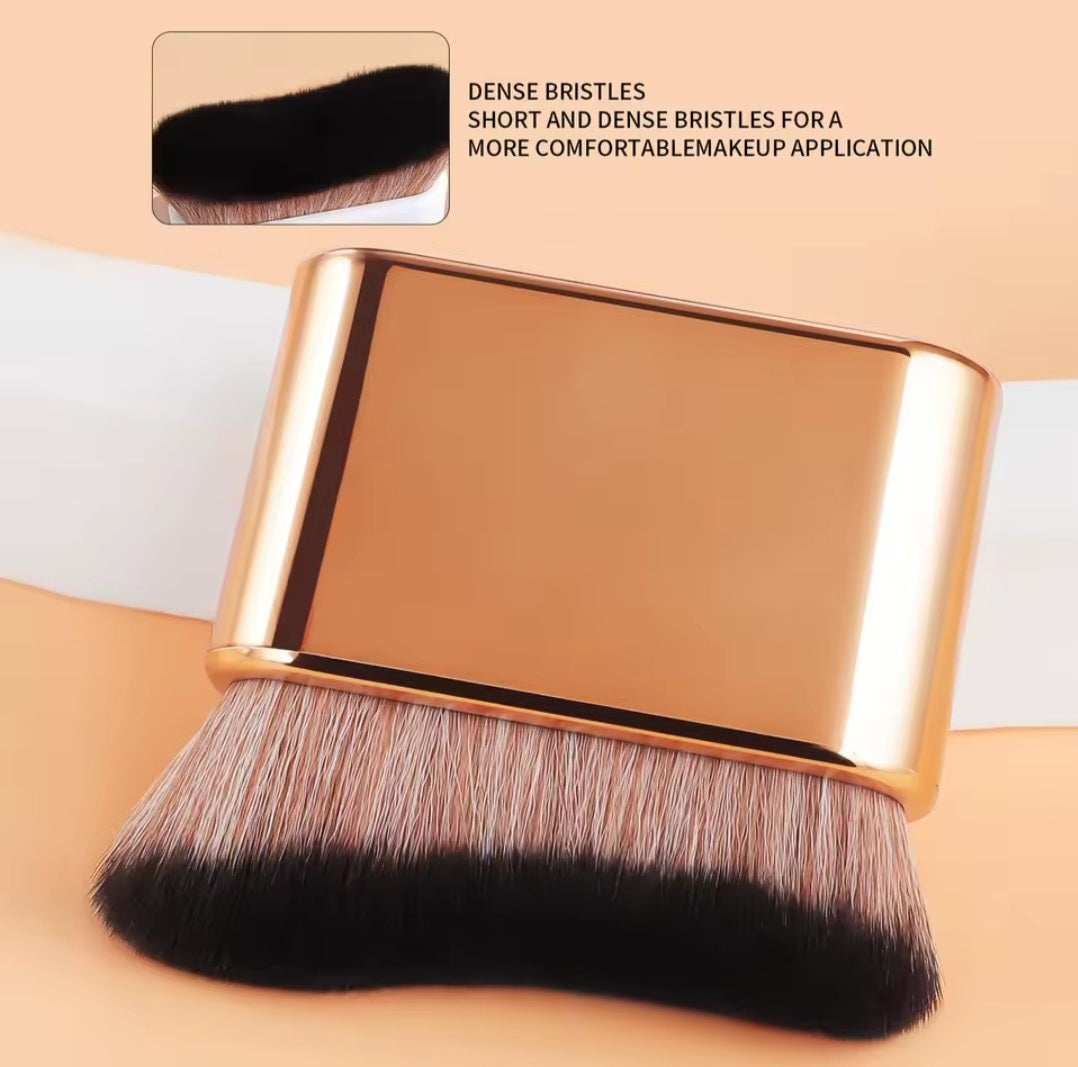 A distinctive makeup brush with a wide, flat rectangular handle finished in metallic rose gold that reads modern and sculptural. The densely packed bristles form a gentle wave shape with a warm brown base fading to black tips, shaped to follow facial contours for even product placement. The handle’s broad profile gives a solid, ergonomic grip that feels balanced in hand and makes controlled, sweeping motions effortless. This piece works well as a statement tool on a vanity and pairs visually with minimalist or luxe beauty collections.