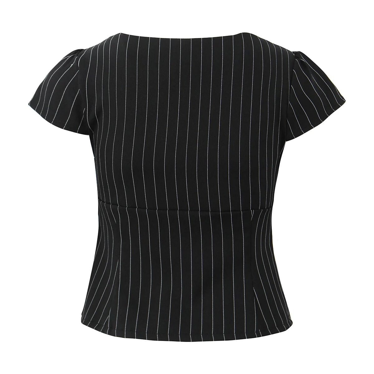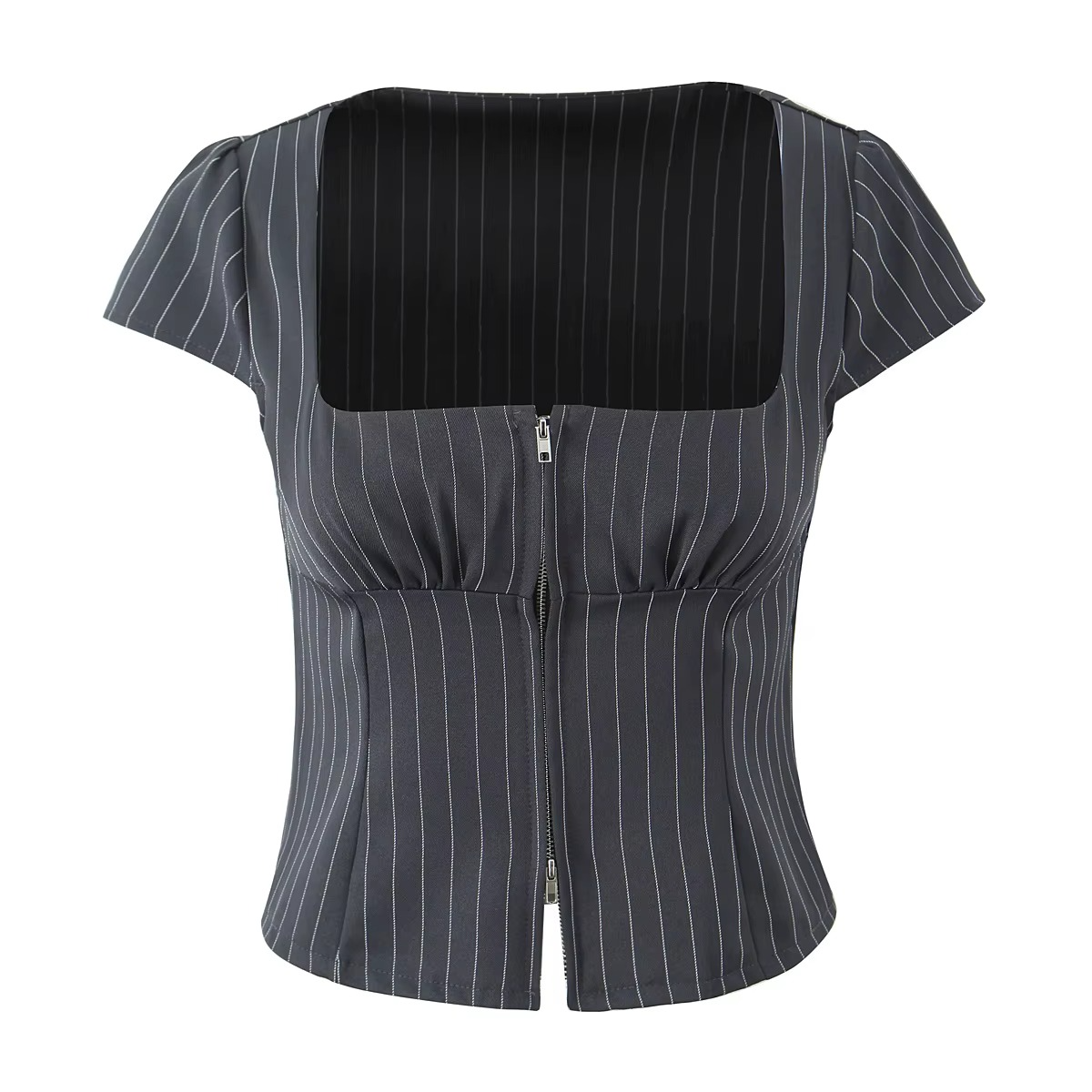 Elevate your wardrobe with this chic and versatile short sleeve top, designed to blend vintage charm with modern flair. Crafted from a soft, breathable fabric, this top features a classic pinstripe pattern that adds a touch of sophistication to any outfit. The square neckline and slim-fit silhouette flatter the figure, while the front zipper detail introduces a bold, contemporary edge.