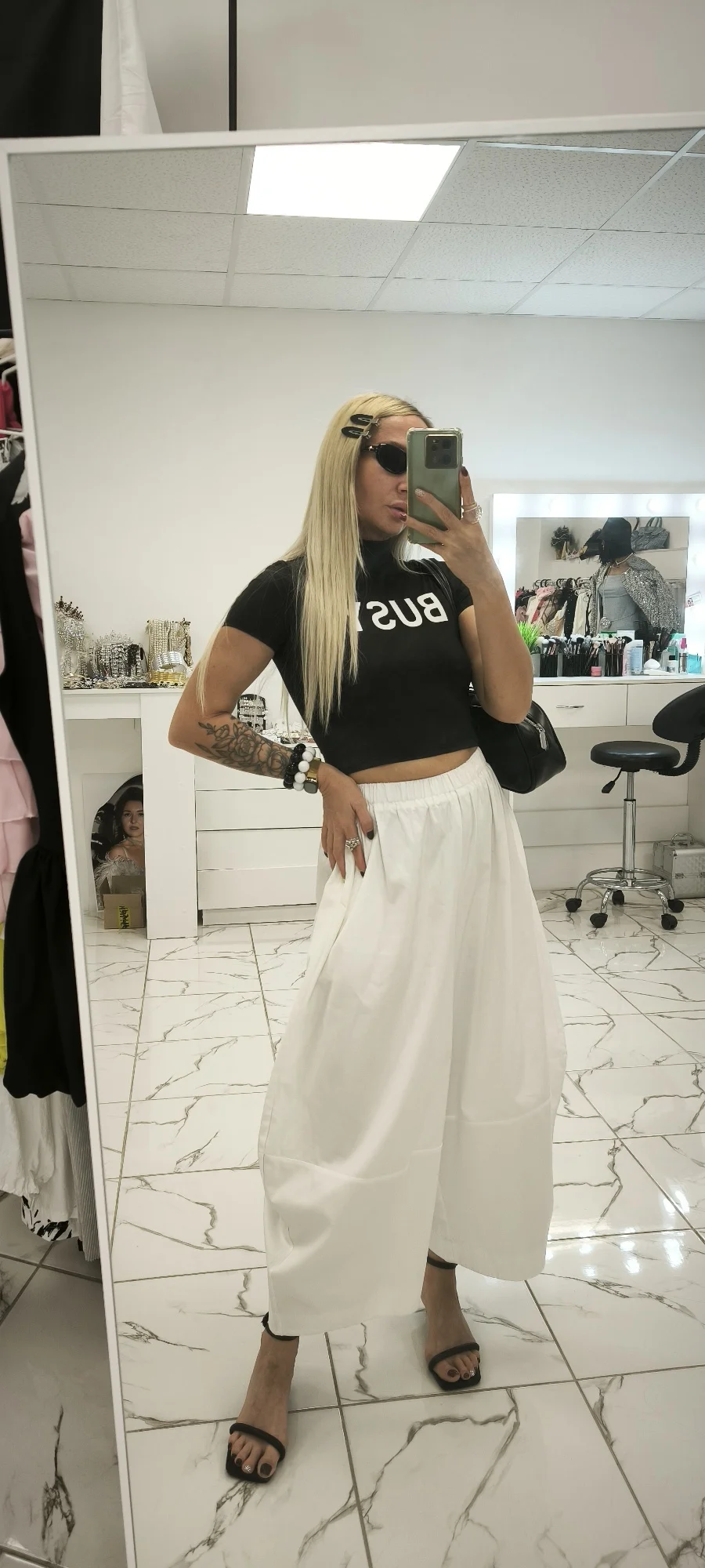 Make a bold statement with this edgy and playful "BUSY" crop top, designed for fashion-forward individuals who love minimalist style with maximum impact. Crafted from soft, breathable cotton-blend fabric, this fitted tee features a clean black base with striking white lettering across the chest that reads “BUSY” — perfect for expressing your mood without saying a word.